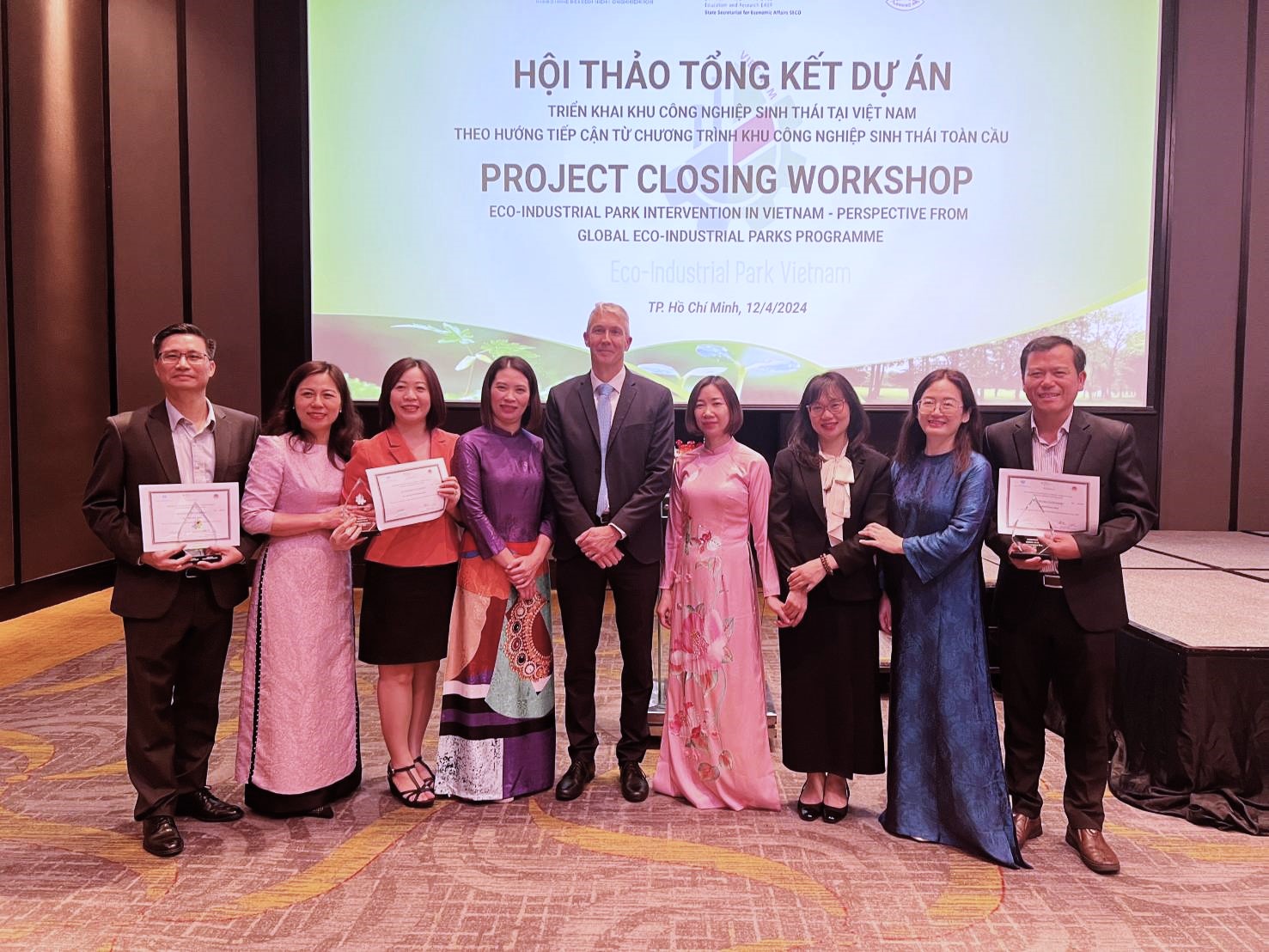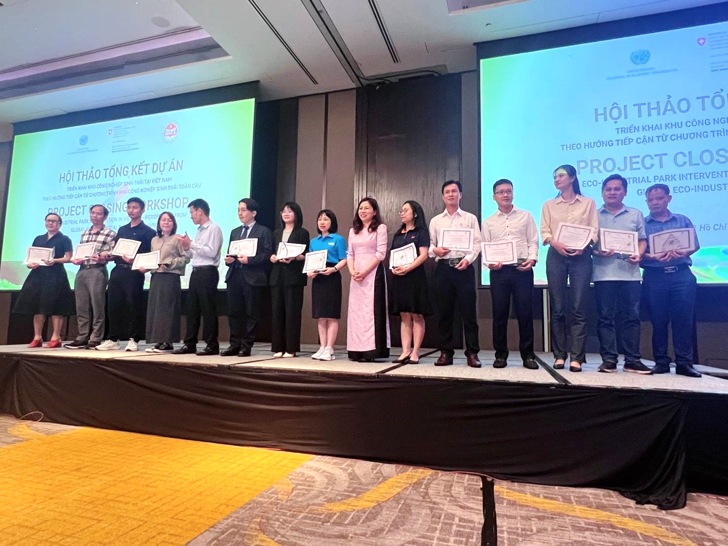 Ảnh chụp ở trên: Tại Hội thảo Kết thúc Dự án, các đối tác và bên tham gia dự án, bao gồm các trưởng nhóm dự án, đã được vinh danh bằng giấy chứng nhận.