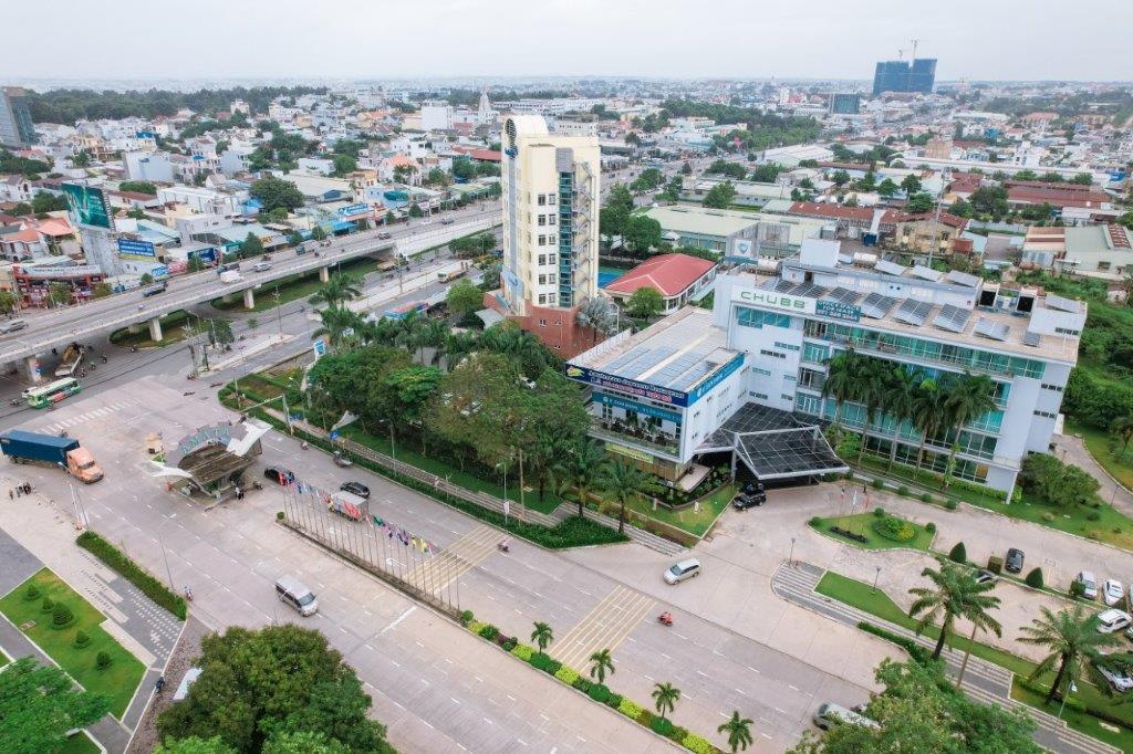 Ảnh chụp trên không của lối vào KCN AMATA Biên Hòa, nằm trên Quốc lộ 1A nối tỉnh Đồng Nai với Thành phố Hồ Chí Minh. Khu công nghiệp được thành lập vào cuối năm 1994